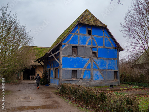 granja de fachada de color azul intenso u entramado de madera con cielo nublado