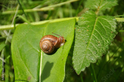 Grape snail on a green leaf close-up. Wildlife, animals, macro, mollusca, fauna, flora