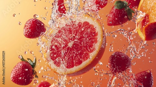 Grapefruit and strawberries splashing in water