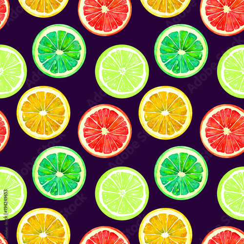 Grapefruit, orange, lime and lemon, seamless pattern design, hand painted watercolor illustration, dark blue background
