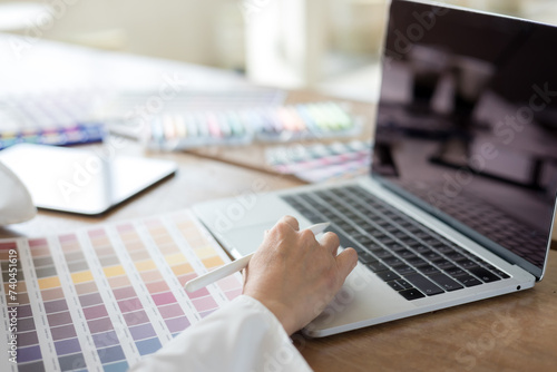 Graphic designer using color swatch to do his work at modern office. Architect using work tools and sample colour catalog.