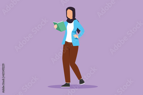 Graphic flat design drawing happy beautiful woman standing and reading book at library school. Pretty Arabian female reader enjoying literature or preparing for exam. Cartoon style vector illustration