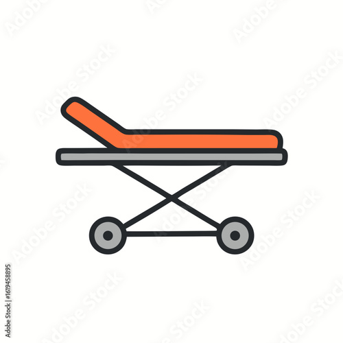 Graphic illustration of an orange reclining chair on a wheeled dolly against a white background