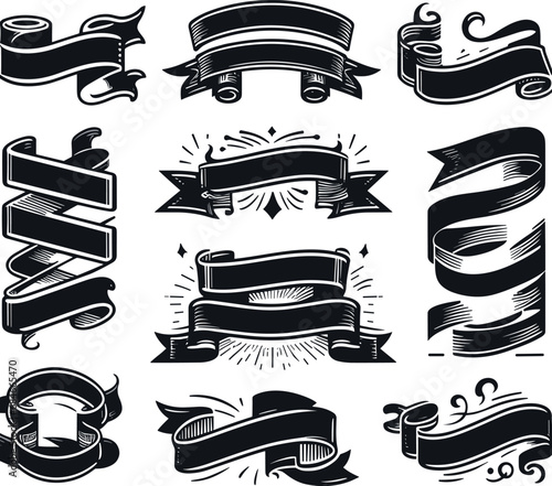 Graphic set of simple rectangle ribbons Vector black shape Image white background