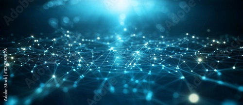 Graphicon banner with blue abstract background, a network grid, and particles arranged in a network. Sci-fi digital technology, network connection and data graphics. Developed with stock (AI).