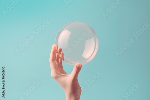 Grasping a Floating Transparent Sphere in Hands Against Pastel Backdrop