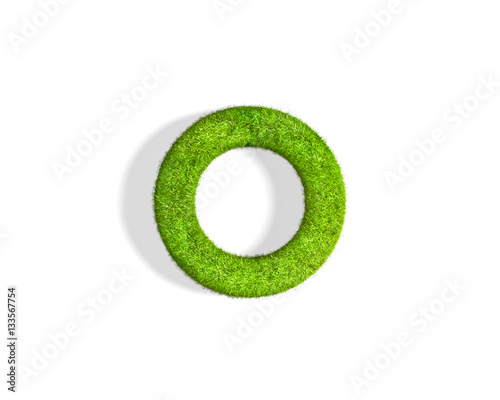 Grass letter O in lowercase format from top angle with shadow on ground.