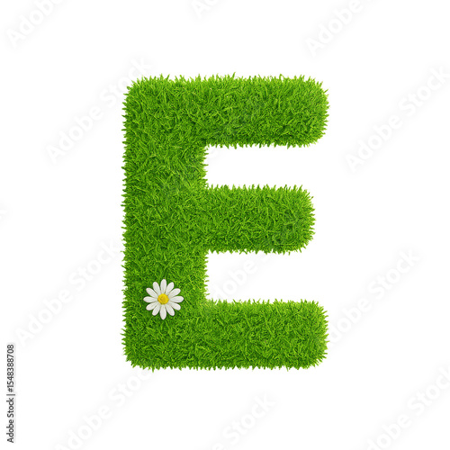 Grass-Covered Capital Letter E with Small Flowers on Transparent Background