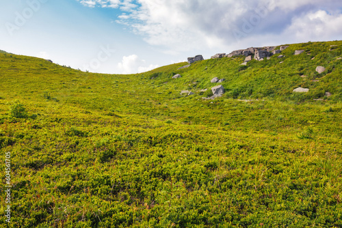 grassy meadow landscape of ukrainian mountains. carpathian countryside in summer. sunny morning with clouds on the sky