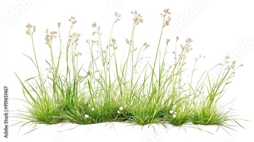 Grassy tufts with sporadic small white flowers against a white background, exemplifying common wild grass seen in meadows or untamed gardens.