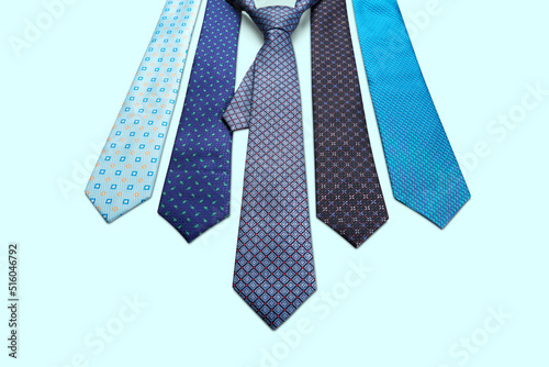 Gravatas azuis, em close up, em fundo de madeira e celular mostrando a câmera