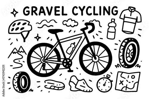 Gravel cycling doodle with riders, bikes, and mountain trail adventure elements, Transparent Background