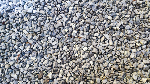 Gravel road stone texture. Gray gravel pattern. Closeup road with small rocks background