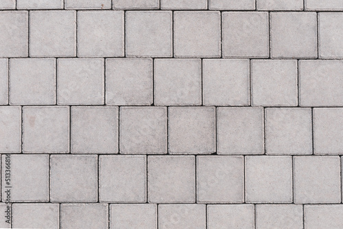 Gray brick stone on street. Top view. pavement texture with concrete bricks