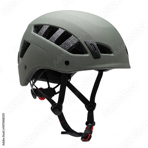Gray climbing helmet with ventilation holes, isolated on white background.