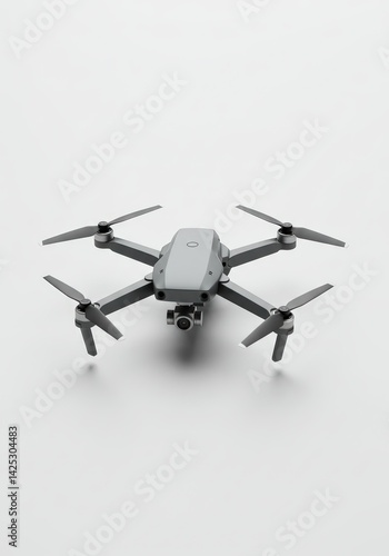 Gray drone captured on clean white background. Aerial footage device for film and photography business. Flying camera unmanned aircraft system technology.