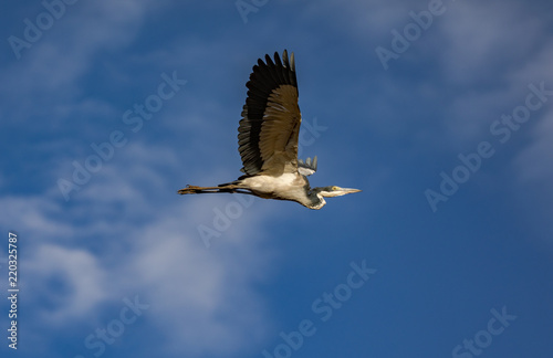 Gray Heron, Ardea cinerea, in flight with cloudy blue sky background