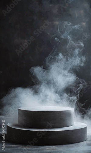 Gray podium with smoke for various products, atmospheric lighting, dynamic composition