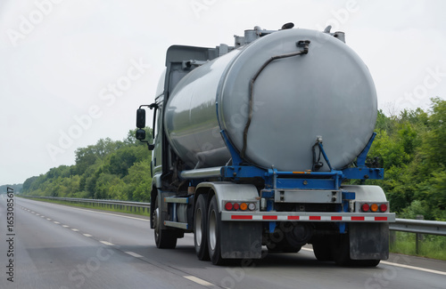 Gray semi truck tanker drives on asphalt highway on summer day. Large vehicle transports hazardous cargo including Arylsulfonic acids with ADR sign displayed. Green trees line roadside, suggesting
