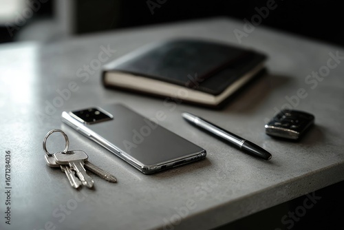 Gray smartphone, notebook, keys, and pen on a light gray surface