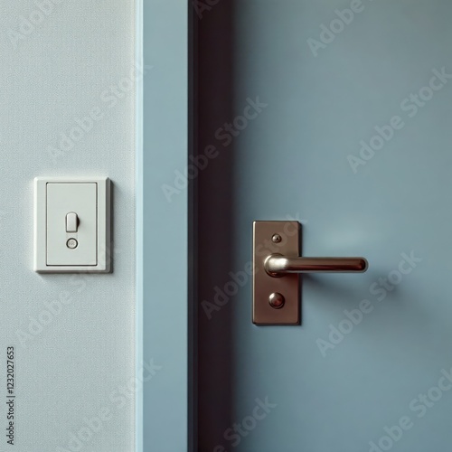 Gray textured wall, light switch near metallic door handle, switchplate, door