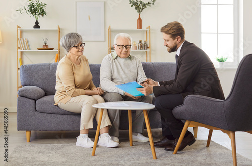 Gray-haired happy smiling senior couple sitting on sofa in the living room at home and having consultation with a male financial advisor about health insurance. Investment in retirement concept