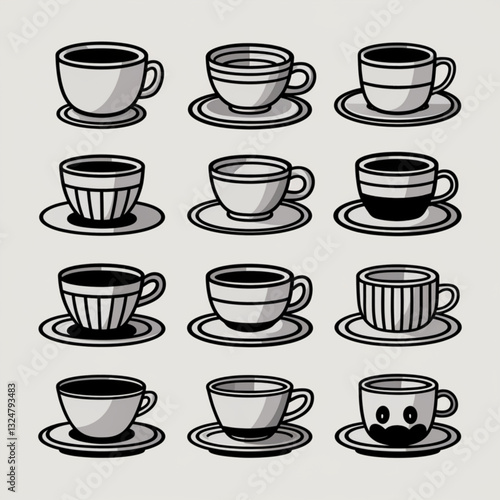 Grayscale Coffee Cups Varied Designs Display [with spaces]
