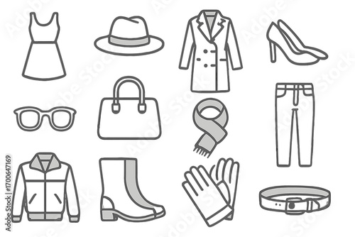 Grayscale Fashion Icons. Line style icons of grayscale fashion: grayscale dress, grayscale hat, grayscale coat, grayscale shoes;