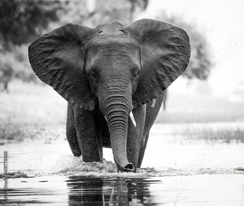 Grayscale shot of an African elephant walking through a shallow river