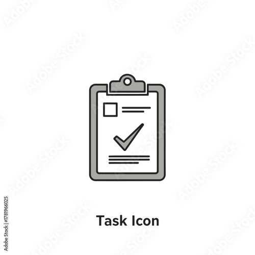 Grayscale task icon of a clipboard with a checklist and checkmark isolated on a white background.