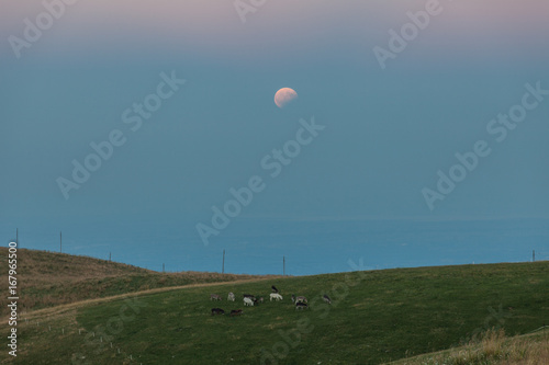 Grazing donkeys under a moon eclispe, Cansiglio, Veneto, Italy