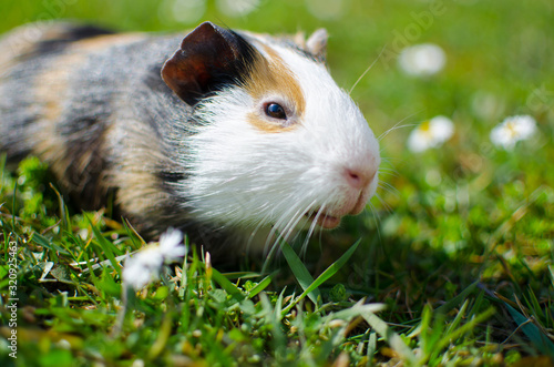 Grazing guinea pig on grass on a beautiful sunny spring day