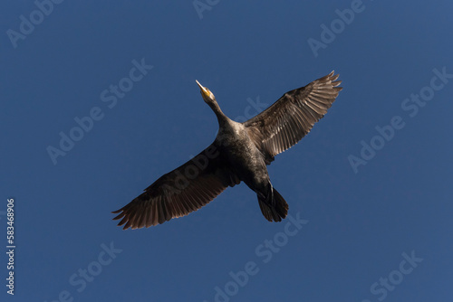great cormorant flying in a blue sky
