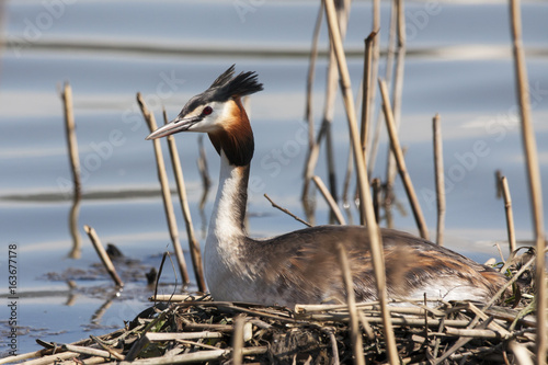 Great crested grebe sitting on nest. Charming beautiful orange white black waterbird breeding. Bird in wildlife.