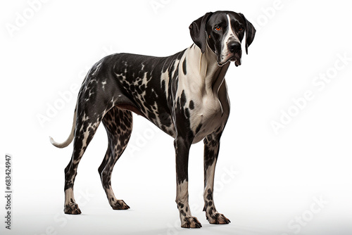 Great Dane dog standing on a white background. Animal right-side portrait.