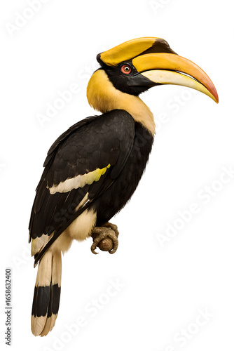 Great Hornbill Perched with Wings Closed, Photorealistic Full Body Portrait with Detailed Feathers and Beak, Isolated on Pure White Background, High Resolution Wildlife Stock Photo