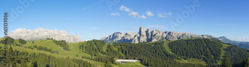 Great landscape on the Dolomites. View on Sella group, Boè peak, Gardenaccia massif and Sassongher summit. Alta Badia, Sud Tirol, Italy