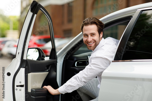 Great offer, businessman buying car sitting in driver seat, testing auto in dealership showroom
