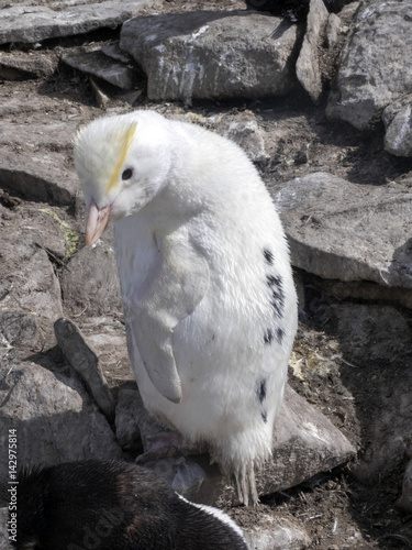 great rarity white, Rockhopper Penguin, Eudyptes chrysocome, Sea Lion Island, Falkland Islands / Malvinas