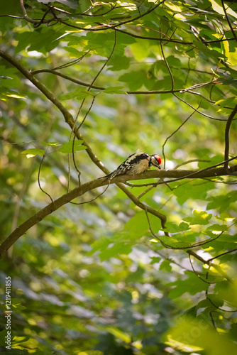 Great Spotted Woodpecker (Dendrocopos major) laying on a branch and packing wood with green leaf background, North Rhine-Westphalia, Germany