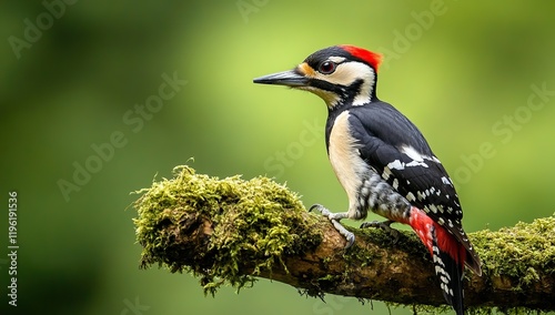 Great Spotted Woodpecker Perched on Mossy Branch in Lush Green Forest