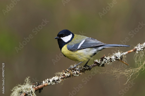 Great tit (Parus major) sitting on a branch in the garden in spring.