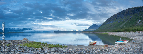 Great View of Calm Mirror lake Akkajaure in Big Lake National Park In Lapland, northern Sweden. Idyllic and Picturesque Evening Scene.
