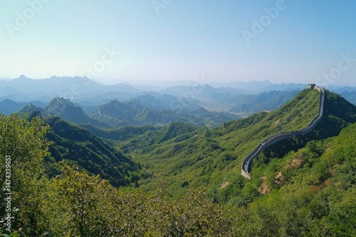 Great Wall of China Landscape Scenery Along Lush Green Mountains and Clear Blue Sky