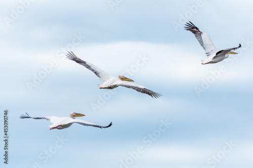 great white pelicans in flight, danube delta, romania