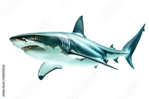 Great White Shark Swimming Against White Background Showing Sharp Teeth