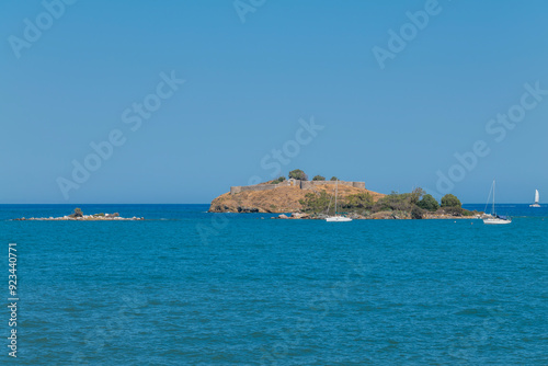 Greece Peloponnese region Poros island and Galatas town seaside sailing boats on the blue sea