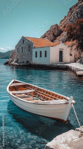 Greek Island House, Wooden Boat, Blue Sea, Dramatic Lighting, Coastal Scene
