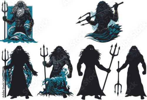 Greek Mythic Sea God Poseidon Silhouette Vector Illustration Set