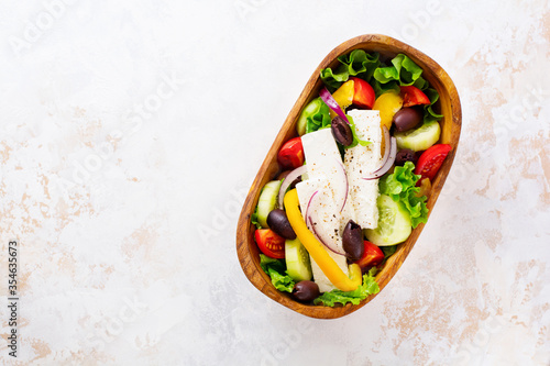 Greek salad in wooden plate on a white background. Traditional Greek dish. Selective focus. Top view.